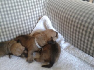 28.3.2012 Malé Cilunky již otevřely očíčka a koukají vyjeveně na ten svět.Jsou to takové baculky,máma Cilka se o ně vzorně stará.Vypadají jedna jak druhá,krásné fenečky s předpokladem výborného exterieru.No mají být po kom,táta úžasný Richard a naše sluníčko Cilunka.Tak uvidíme jak se vybarví.