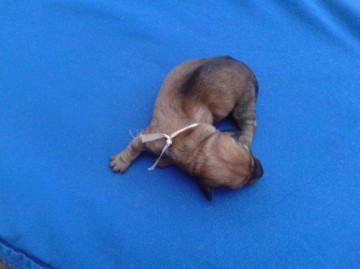 Dva kluci a tři holky.Agneska kolem páté hodiny začala s přípravou na porod,kolem sedmé to vypadalo ,že už to bude a první miminko bude venku,ale moc se mu nechtělo.Po konzultaci s paní veterinářkou jsme ještě čekali,jestli se to nerozběhne,ale v devět hodin odešla první plodová voda a miminko nikde.Musela jsem jí vyšetřit ,kde se nachází mimouš,byl tam naštorc ,zadíčkama napřed a nechtěl se otočit.Tak nezbývalo nic jiného,než opět volat paní doktorku a urychleně jet do ambulance.